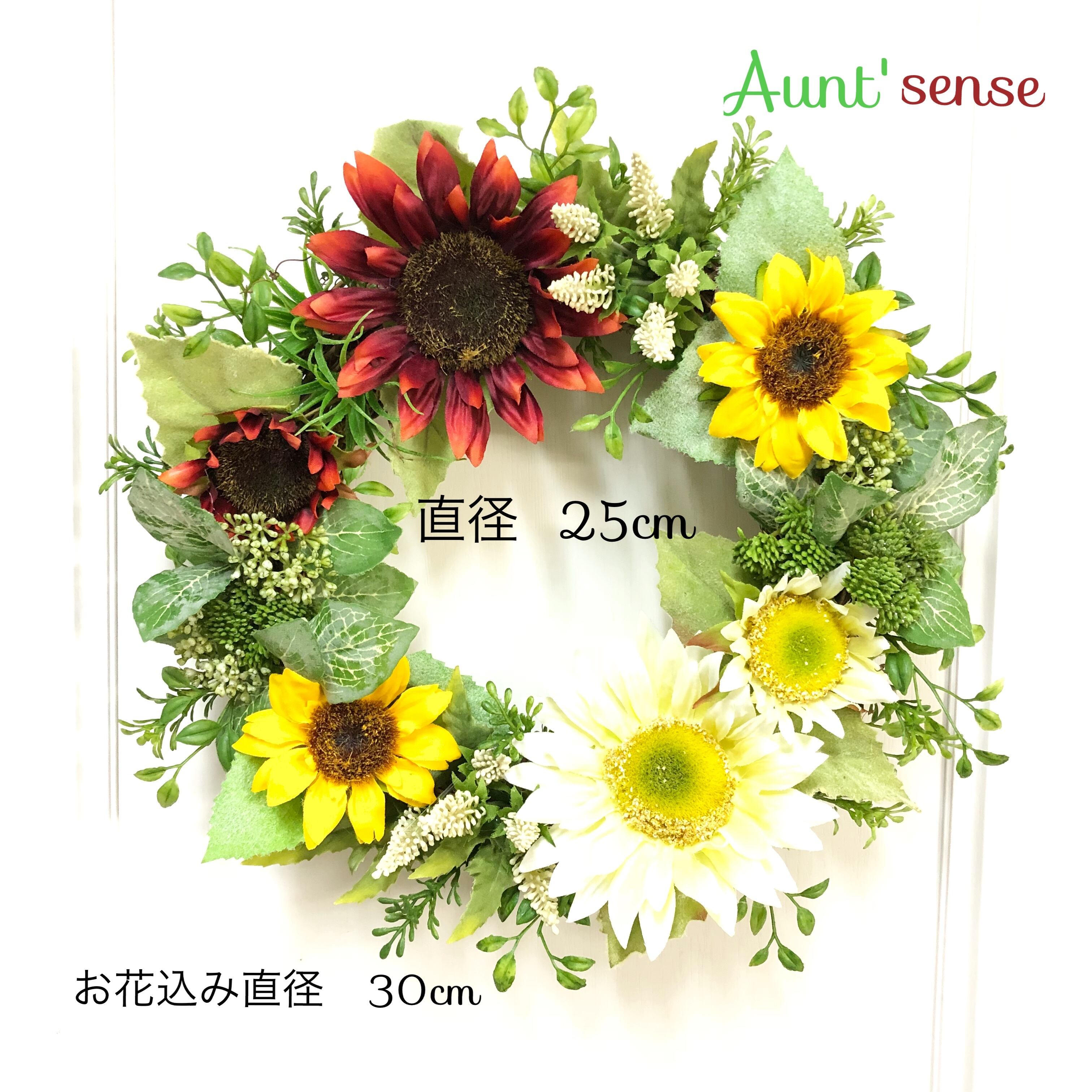 真夏のお庭に咲くひまわりを リースにしてみました。 3色のひまわりがグリーンの葉の中で 素敵に並んで、とても雰囲気のある 生花の様なリースです。 土台は直径25cmのつるリースですが、 お花が大きいので出来上がりは30cmあります。 (造花)