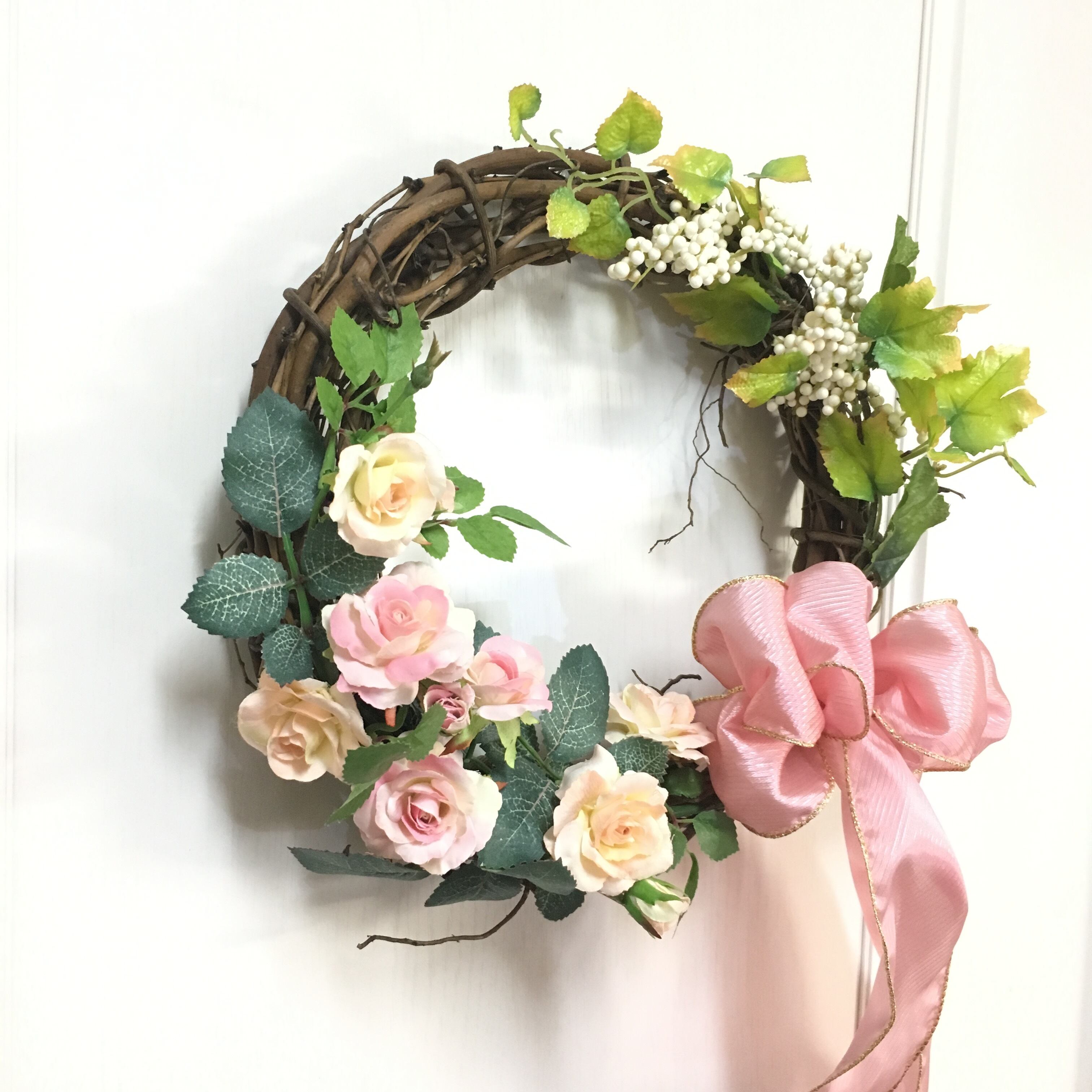 ピンクのドレスを着ている様な、お洒落なリースになりました! 優しい色使いがポイントです。 直径25cm (造花)