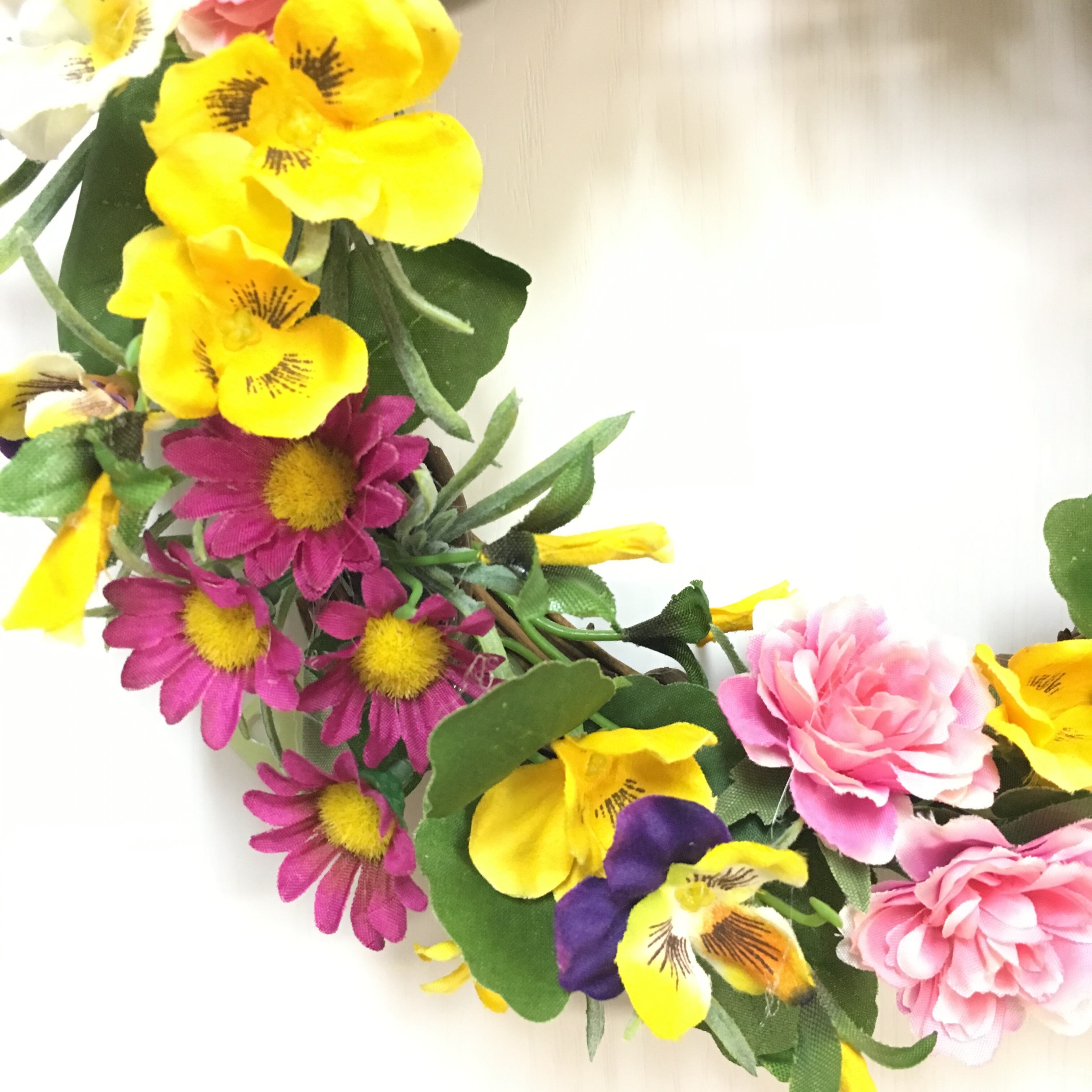 パンジーのリースは珍しいと思います。 明るい色を散りばめているので、 ドアに飾ったら、とても目を引く可愛いリースです。 直径20cm(造花)