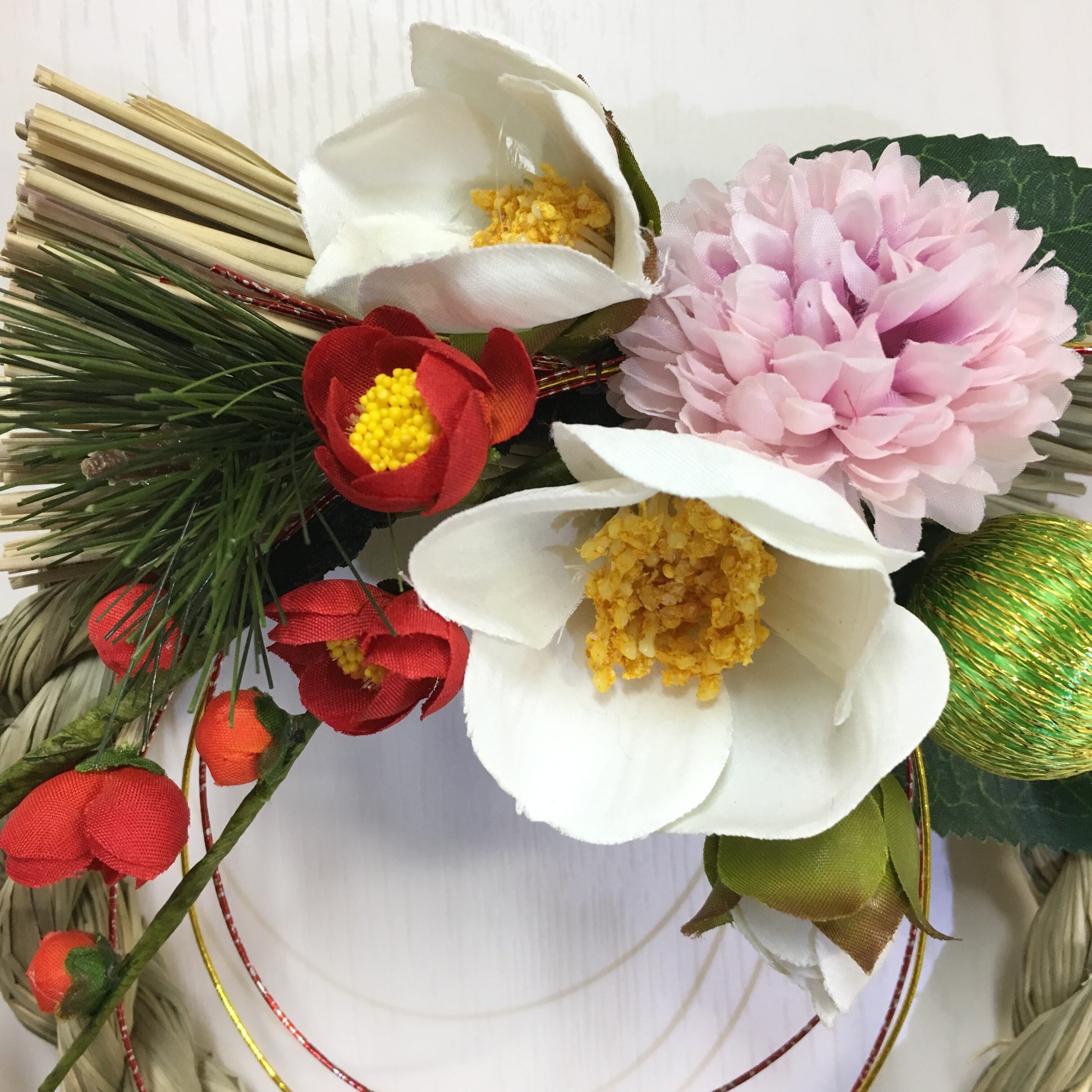 小さなしめ縄ですが、梅、ツバキ、菊、松が 可愛らしく入っています。 直径17cm (造花)